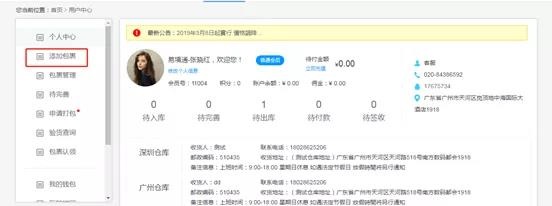 1、登录并进入会员中心,点击“添加包裹”即可进行下单。