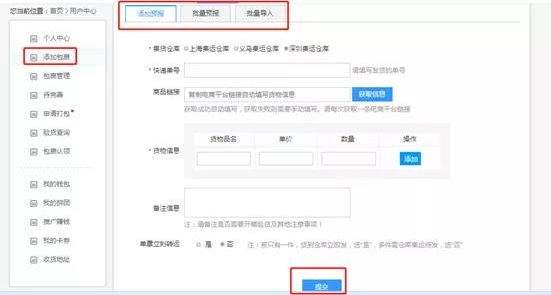 2、点击“添加包裹”后会出现以下界面,预报有三种方式,我们这里以添加单个包裹为例:在填写资料,确定无误之后,点击“提交”即可完成下单。