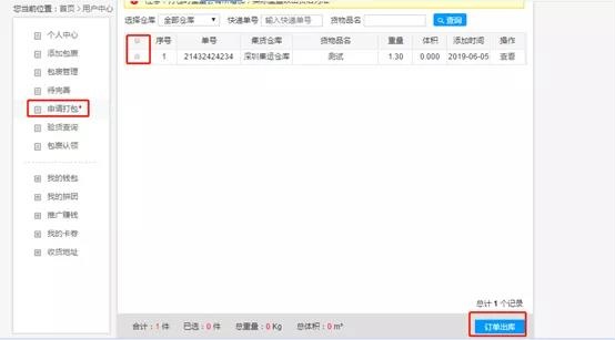 2、仓库入库之后,客户端会显示在【申请打包】里面,如果客户需要发货的话,就选择订单,点击【订单出库】提交申请。