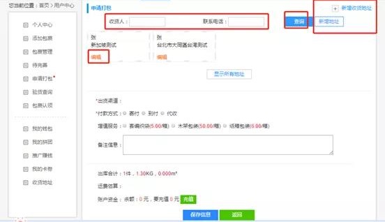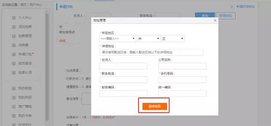 4、除了在收货地址里面添加地址之外,申请打包页面也可添加地址,点击【新增地址】,弹出弹窗,填写完成之后,点击【保存信息】即可。